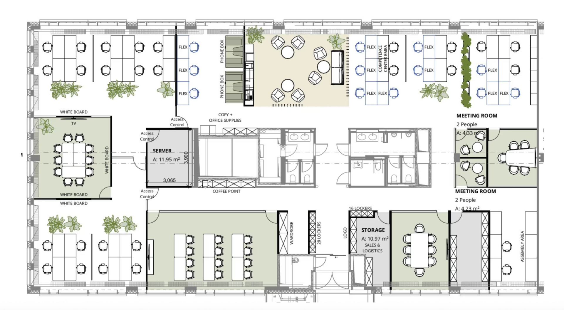 There is a cafeteria, canteen, bicycle storage with showers available for tenants. In the basement there are storage rooms and sufficient parking spaces.