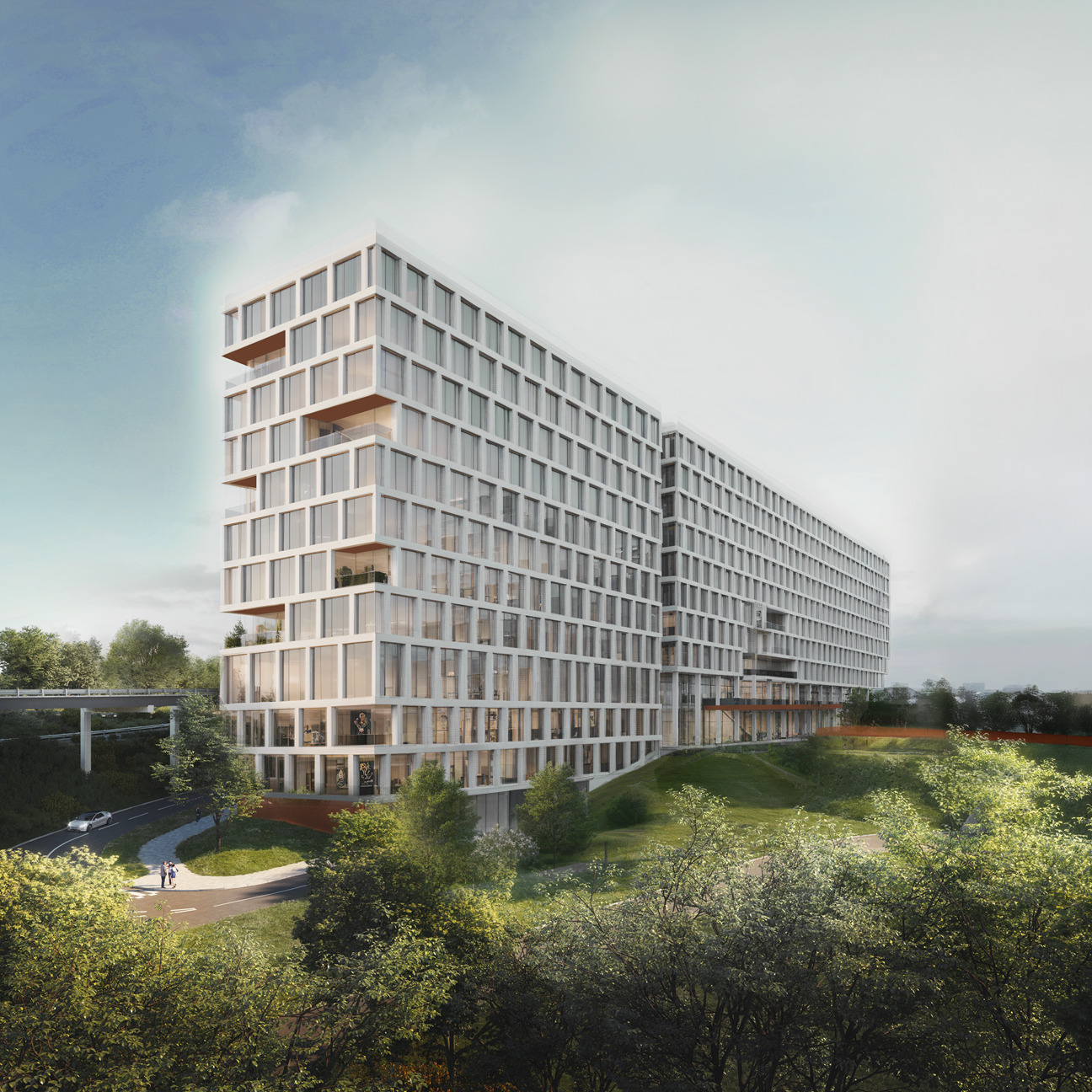 The Sequoia office building represents a unique combination of a vibrant city and the tranquility of nature in the form of the unique Krč Forest and the revitalized Roztyl Park. Modern technologies – heat pumps, photovoltaics, air ionizers, outdoor blinds eliminating heat gains from the sun, etc. – ensure long-term sustainable economic operation. Sequoia will offer 33,000 m² of office space for rent on eleven above-ground floors. Some of the offices on the western side of the building will be equipped with loggias. The building will also include a conference hall. The top, twelfth floor will feature a rooftop terrace with a beautiful view. The building will provide its tenants with 488 underground parking spaces, bicycle storage rooms with facilities, and is also prepared for electromobility. For convenient access by car, a direct exit from the Prague Ring Road is planned. The building will have a BREEAM Outstanding certificate and will meet the parameters of the EU TAXONOMY. The design is by the A8000 studio, and the first tenants will be able to move into the state-of-the-art offices with flexible layouts at the turn of 2027/2028.